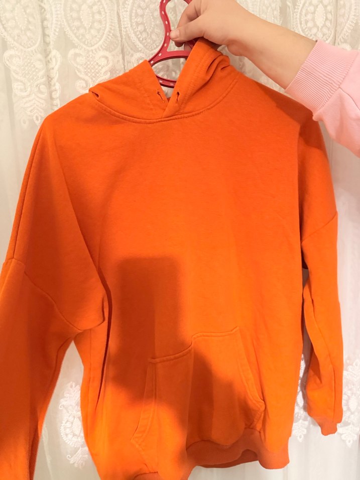 Turuncu renkte, uzun kollu, kapüşonlu ve bol kesim kadın sweatshirtü. Yumuşak ve sıcak kumaştan yapılmıştır, rahat ve renkli bir görünüm sunar.