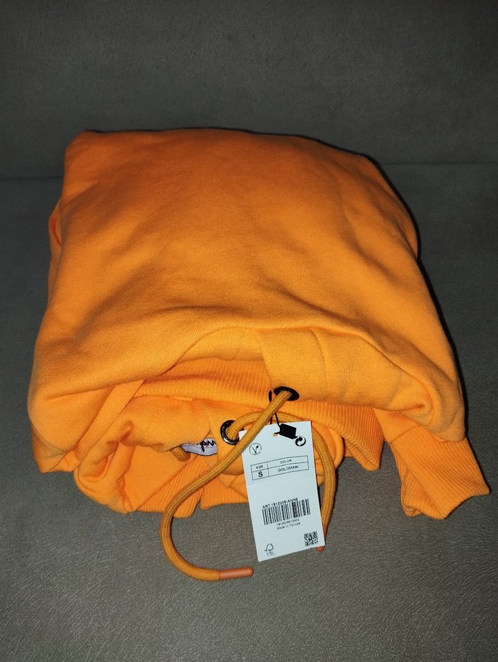 Turuncu kapüşonlu sweatshirt, bol kesim, uzun kollu ve fermuarlı. Yumuşak ve sıcak kumaştan, gündelik ve spor tarzlar için uygun.