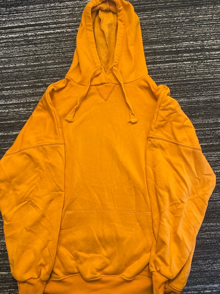 Yumuşak ve sıcak kumaştan, kapüşonlu, uzun kollu, bol kesim turuncu sweatshirt. Düz tasarımı günlük kullanım için uygundur. Önünde ufak tefek lekeleri mevcuttur