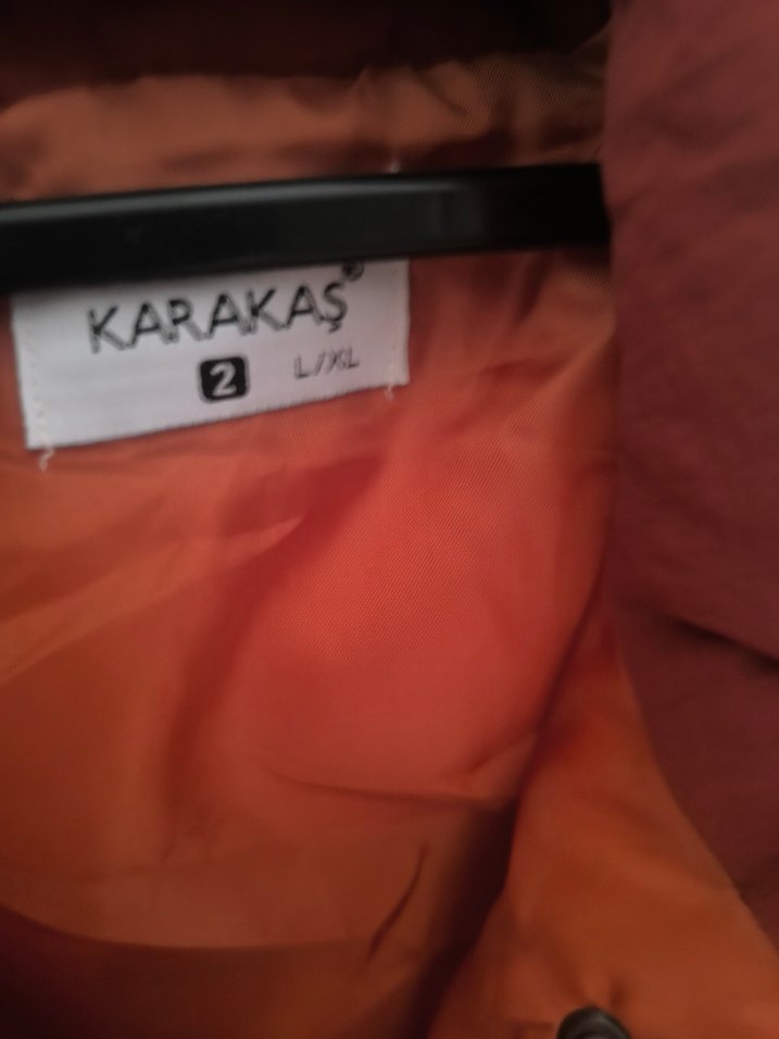 Bu koyu turuncu sentetik kumaştan yapılmış parka, kapüşonlu ve fermuarlı olup, bol kesim ve uzun kolludur. Günlük kullanım için sokak tarzı baskıya sahiptir. Marka: KARAKAS.