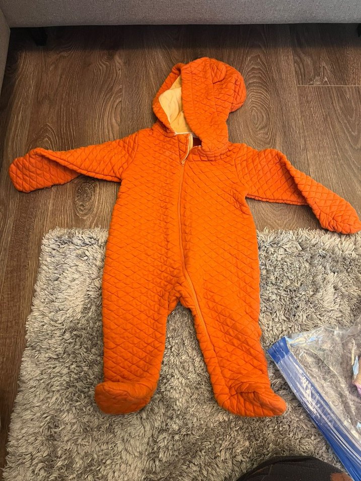 Turuncu renkte, kapüşonlu ve ayaklı örgü bebek tulumu, bebeğinizi sıcak tutar ve rahatlık sağlar. ❄️