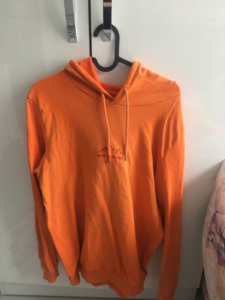Turuncu, parlak renkte, uzun kollu ve kapüşonlu sweatshirt. Rahat ve normal boyda, baskılı tasarımıyla sokak modasına uygun.