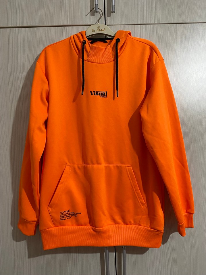 Turuncu kapüşonlu sweatshirt, uzun kollu ve rahat kesim. Ön cepli, siyah ip detaylı ve baskılı, renkli günlük kullanım için uygundur.