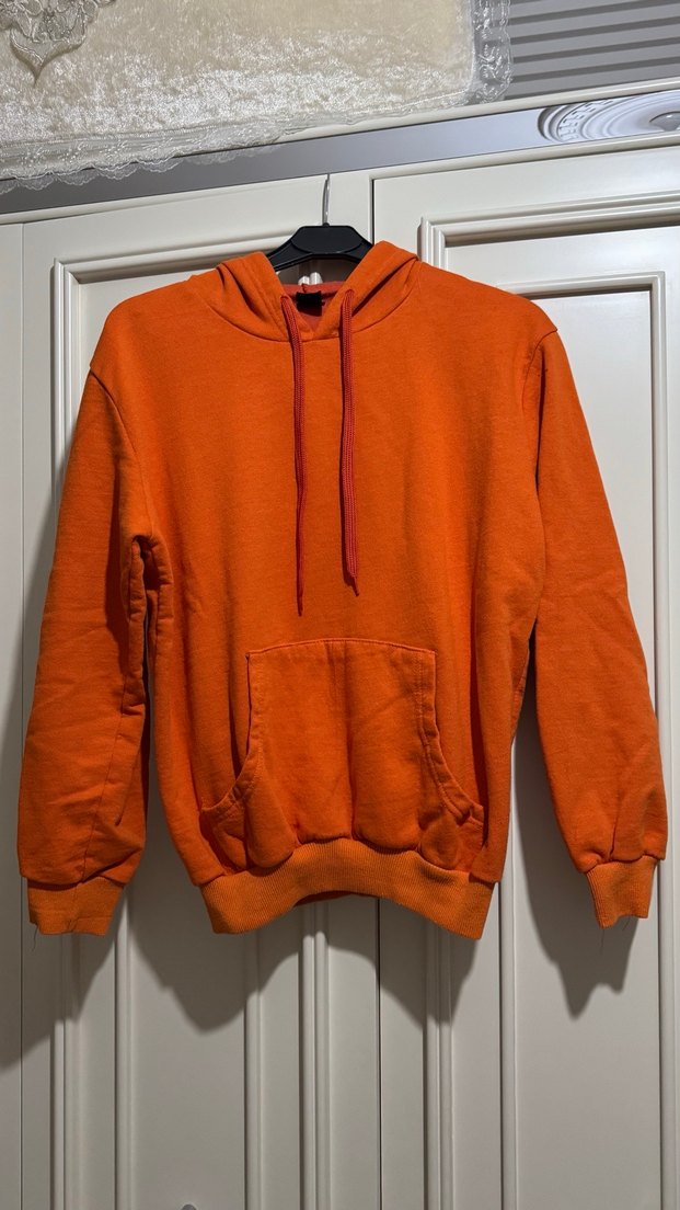 Turuncu kapüşonlu, uzun kollu ve bol kesim sweatshirt. Yumuşak ve sıcak kumaştan, ön cep detaylı rahat ve günlük kullanıma uygun. Kalıbı dar olduğu için bedeni small olarak yazdım