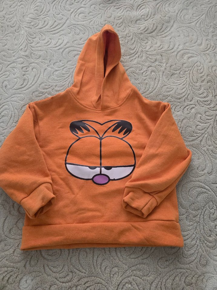 Turuncu kapüşonlu sweatshirt, uzun kollu ve bol kesimdir. Yumuşak ve sıcak kumaştan yapılmış, renkli baskılı ve kabarık tasarıma sahiptir.
