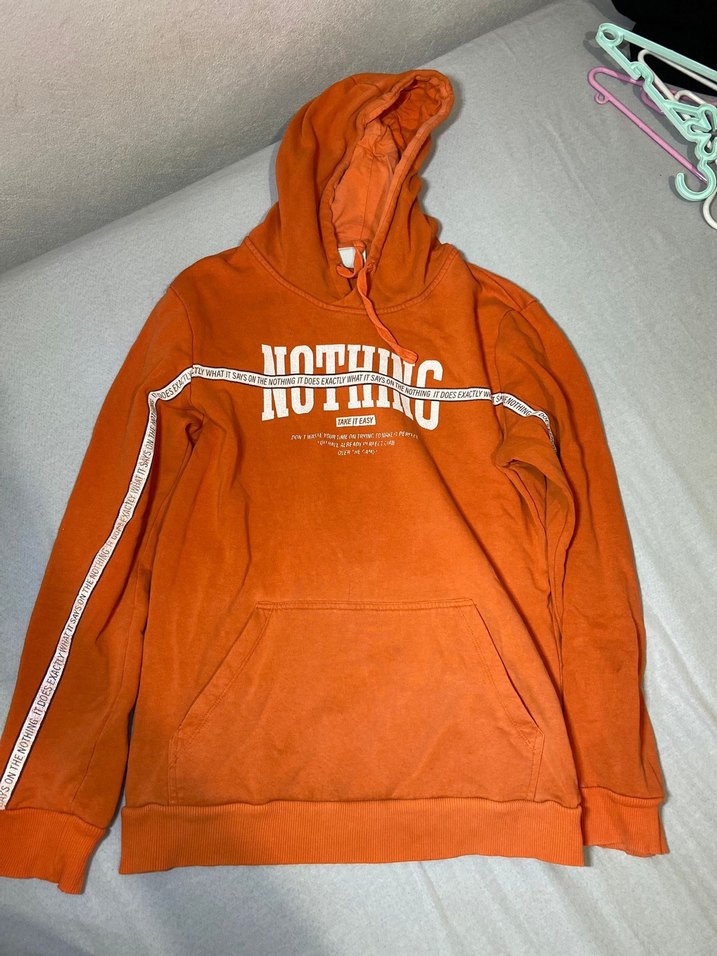 Parlak turuncu renkte, kapüşonlu ve uzun kollu bol kesim kadın sweatshirt. Yumuşak kumaştan olup, ön kanguru cepli ve beyaz yazı detaylıdır.