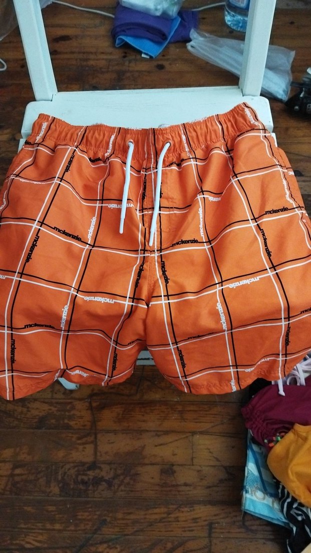 Renkli turuncu kareli desenli, belden bağlamalı ve bol kesim erkek şort, plaj ve gündelik sokak tarzı için uygundur.