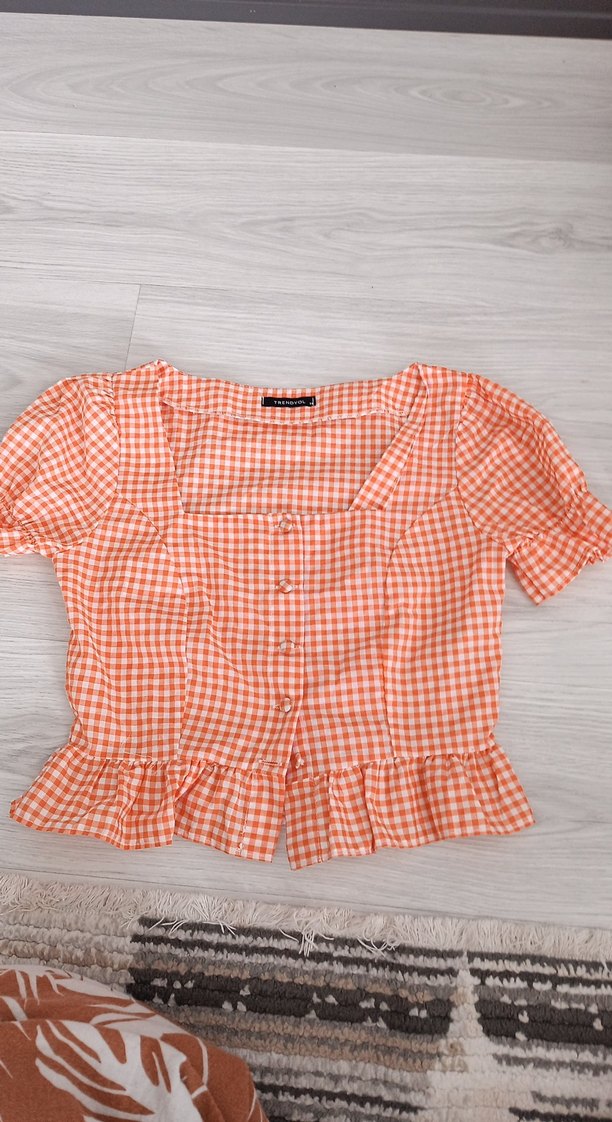 Turuncu Kareli Düğmeli Kadın Bluz