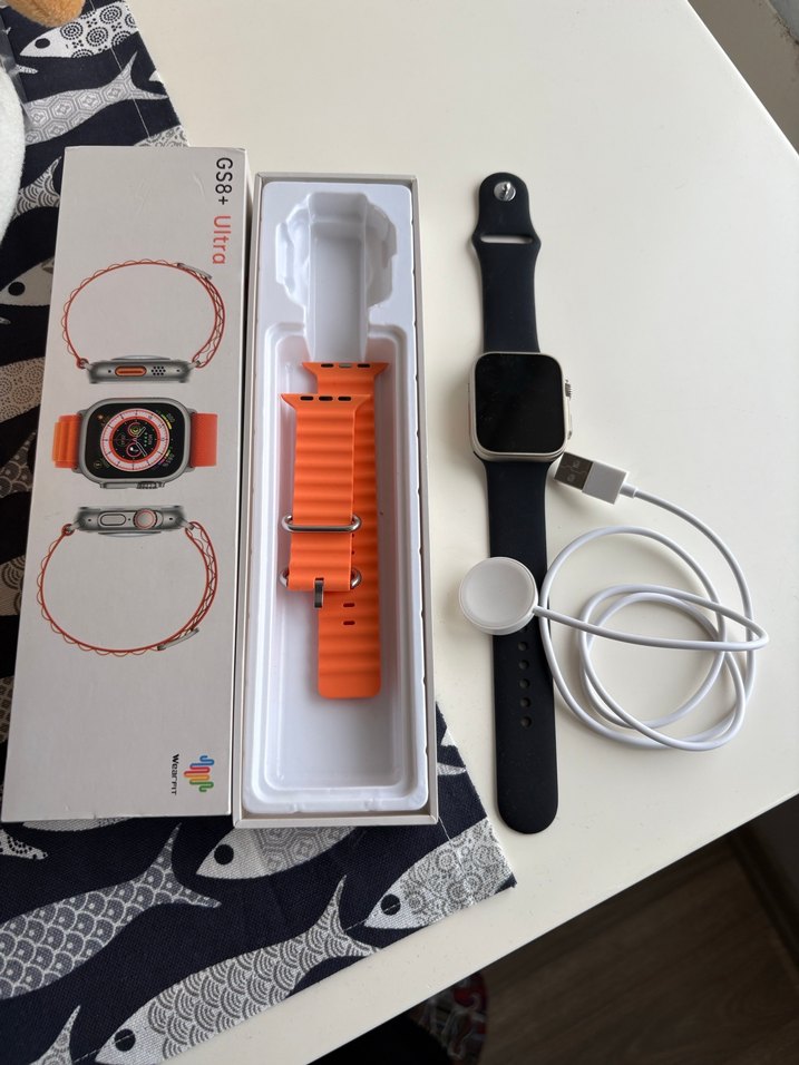 GS8+ Ultra akıllı saat, turuncu değiştirilebilir kayış ve manyetik şarj kablosu ile birlikte gelir. Siyah ekran ve rahat siyah kayışlıdır.Hiç kullanılmadı