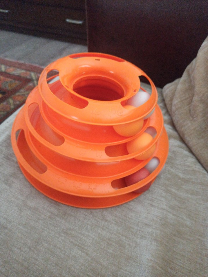 Canlı turuncu renkte, çok katmanlı yuvarlak top oyun seti. Kedinizin topu takip etmesini sağlar.