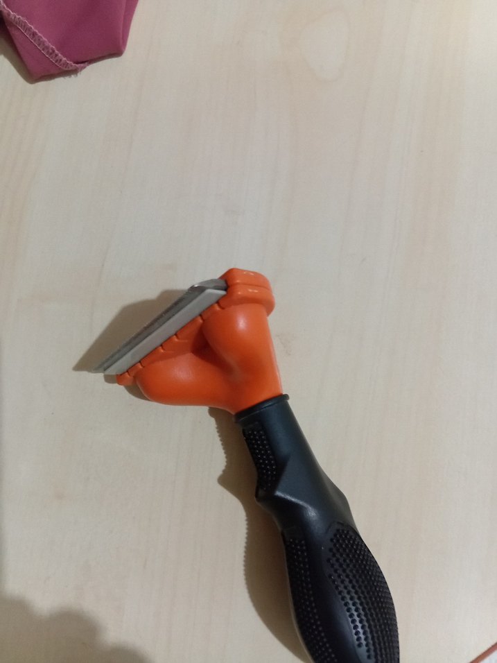 Renkli turuncu kedi tüy toplama tarağı, rahat siyah sap ve gevşek tüyleri almak için metal bıçağa sahiptir.
