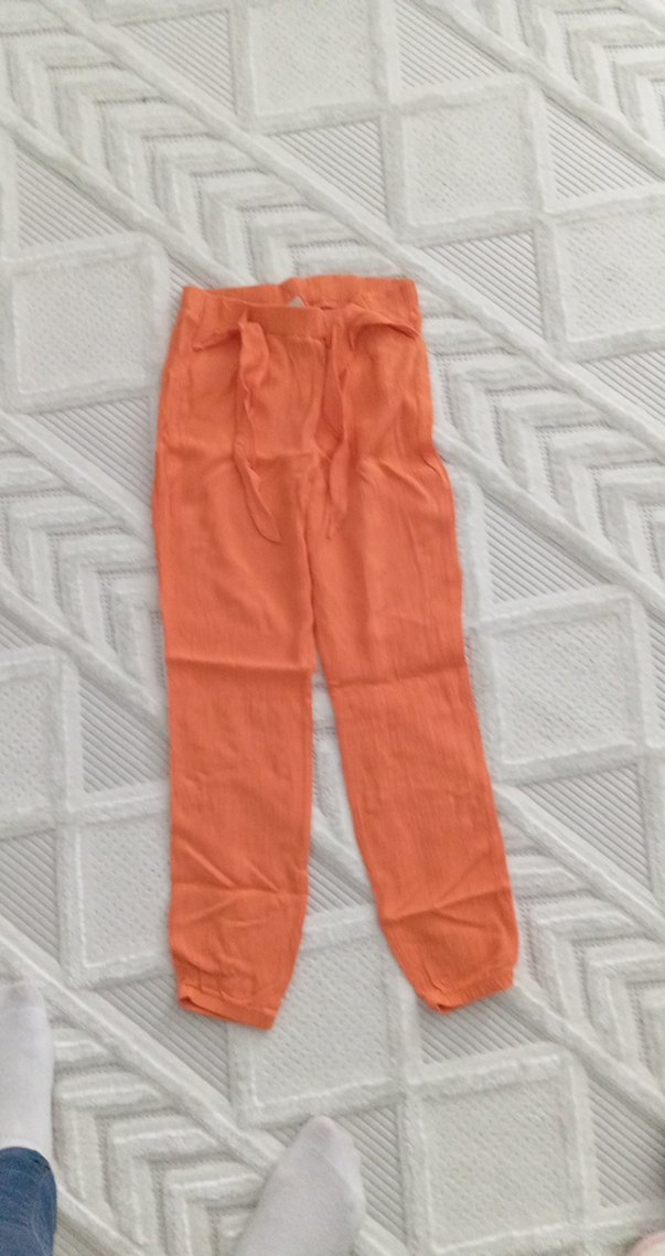 Turuncu keten kumaştan, kemerli ve bol kesim kadın pantolonudur. Midi boyda, gündelik ve normcore tarzda rahat kullanıma uygundur.