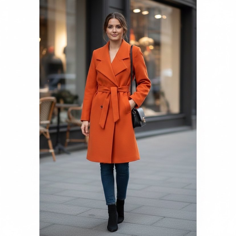 Turuncu, kemerli midi kaban, uzun kollu ve kesimli yaka detaylı. Yumuşak ve sıcak kumaştan, parlak görünümlü, günlük sokak stiline uygun.
