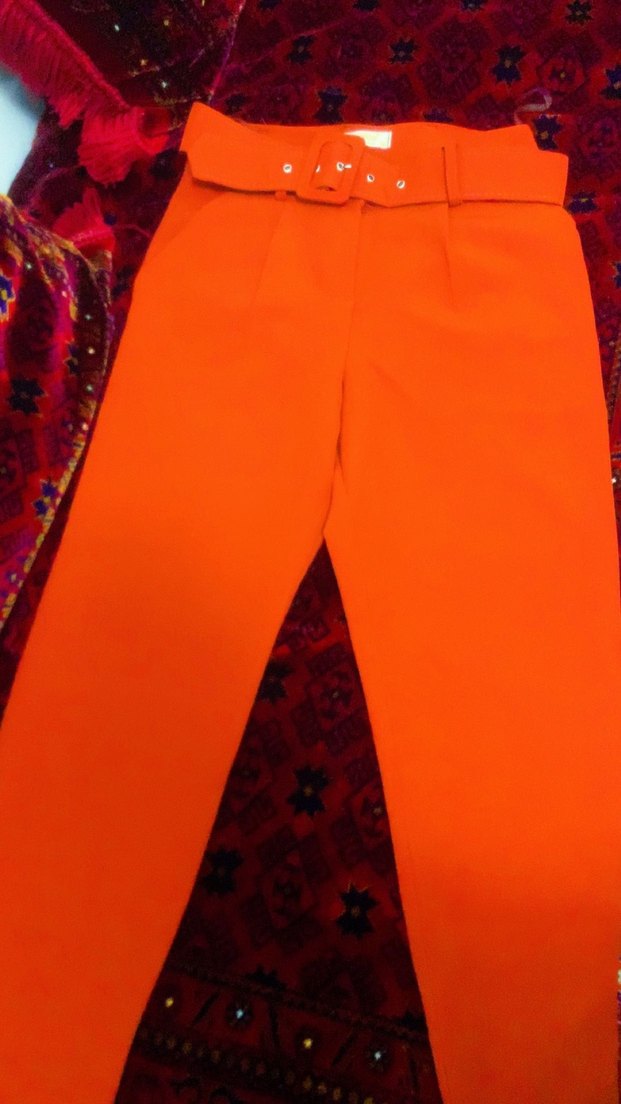 Turuncu renkli, kemerli ve midi boyda kadın kumaş pantolon. Regular fit kesime sahip, sokak modasına uygun rahat bir parça.