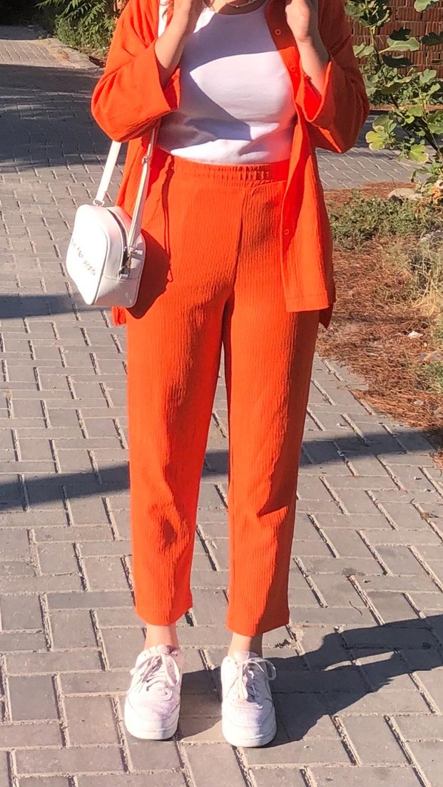 Parlak turuncu keten kumaştan, kemerli ve midi boy, rahat kesim kadın pantolon.