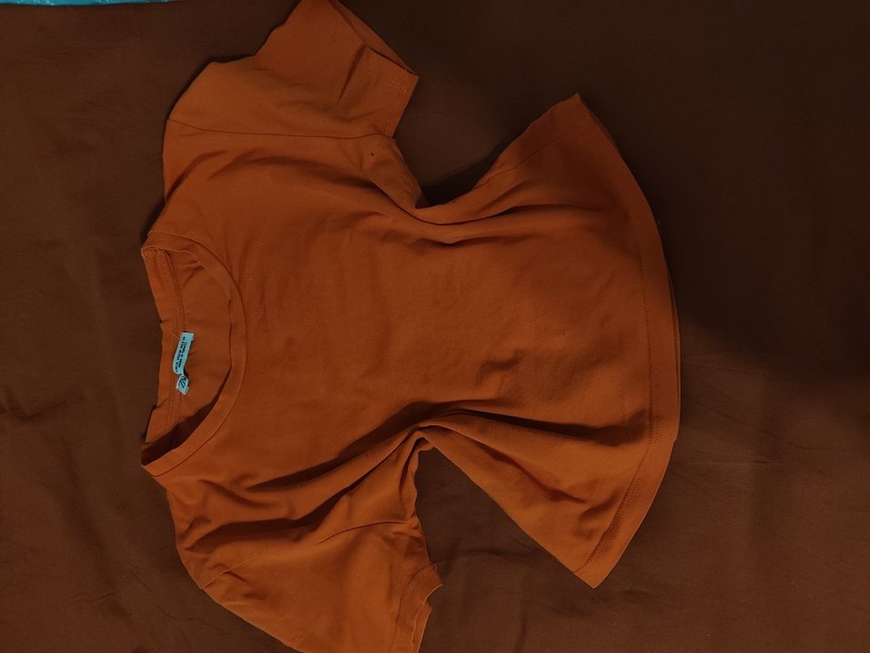 Bu turuncu tişörtü, bisiklet yaka ve kısa kolludur. Normal midi uzunlukta, sade ve minimalist şehir stili sunar.