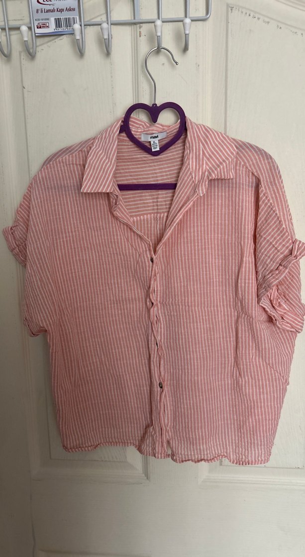 Pastel turuncu keten gömlek, kısa kollu, düğmeli ve yakalıdır. Salaş kesimi ve günlük sokak stili ile rahat kullanım sağlar.