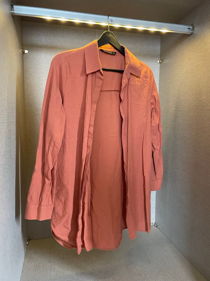 Pembe keten kumaştan, düğmeli, uzun kollu, yakalı ve midi boyda bol kesim gömlek. Günlük rahat kullanım için uygundur.
