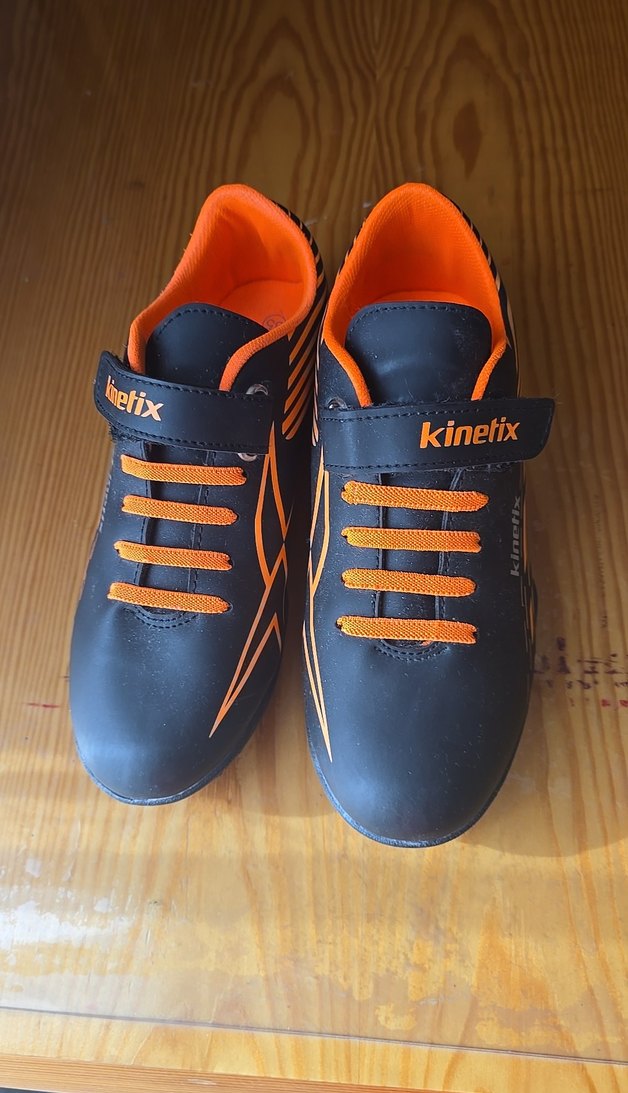 Turuncu renkli, baskılı desenli, Kinetix marka erkek çocuk krampon ayakkabısı. Cırt cırtlı ve kauçuk tabanlıdır.