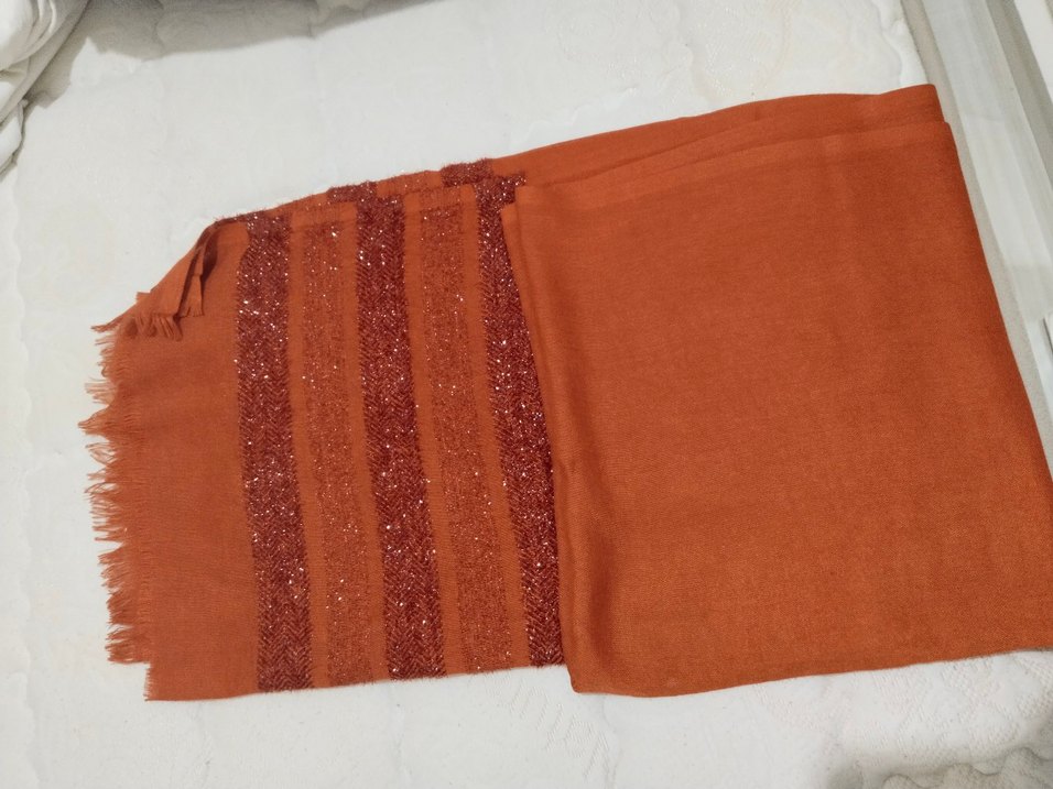 Yumuşak sentetik kumaştan yapılmış, parlak dokulu simli simleri dökülmüyo bu simli gibi bı kumaş ip var adını hatırlamıyorum ondan yapılmış uzun eşarp şal