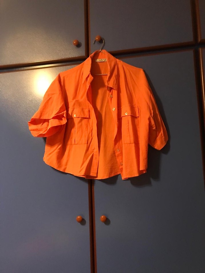 Turuncu parlak renkte, kısa kollu ve düğmeli, keten kumaştan yapılmış bol kesim kadın gömlek. Minimalist ve günlük kullanım için uygun.