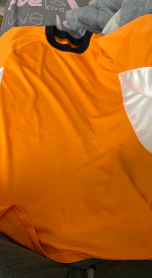 Turuncu, parlak renkli, kısa kollu, bisiklet yaka ve drapeli erkek forma. Sentetik kumaştan, spor ve sokak tarzı için uygundur.