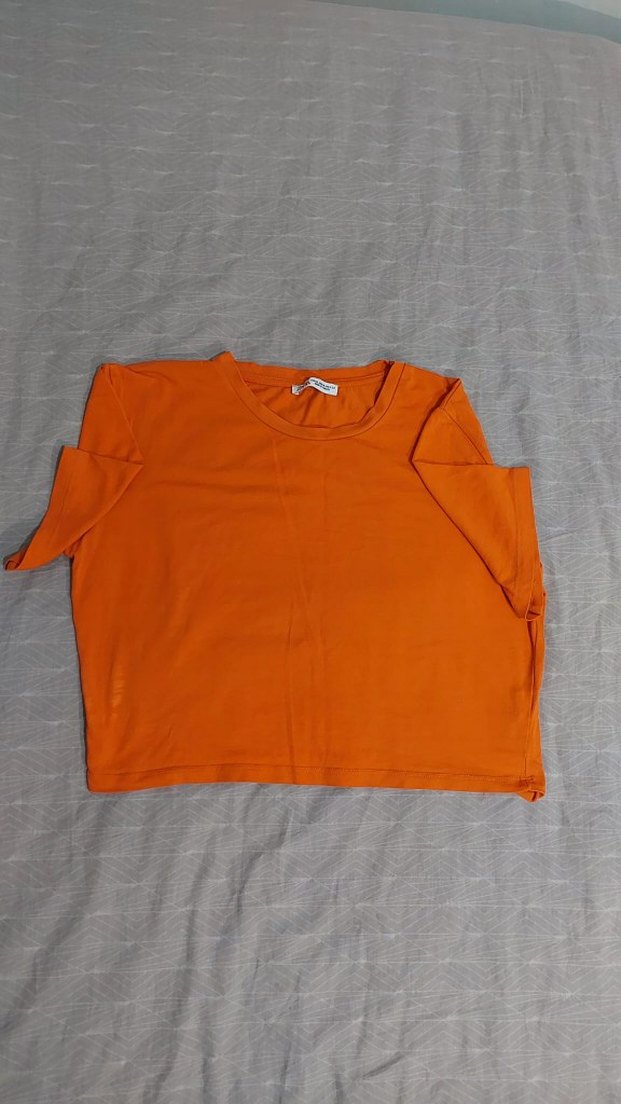 Turuncu renk, kısa kollu, yuvarlak yakalı keten kumaştan, rahat kesim basic tişört. Günlük kullanım için uygun.