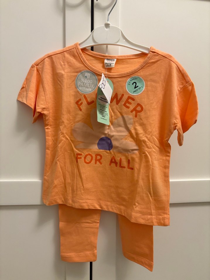 Turuncu pastel tonlarında, kısa kollu, baskılı üst ve pantolonlu bebek kız takımı. %100 pamuk, rahat ve şık.