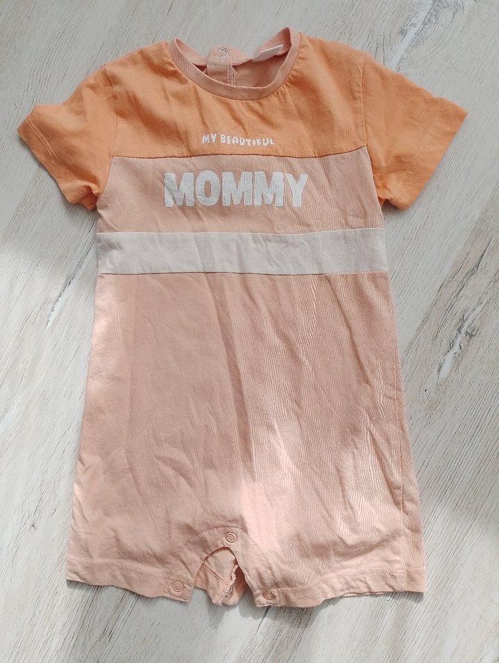 Pastel pembe renkli, kısa kollu ve yuvarlak yaka erkek bebek tulumu. Ön kısmında "MOMMY" yazısı baskılıdır. Yumuşak sentetik kumaştan üretilmiştir.
