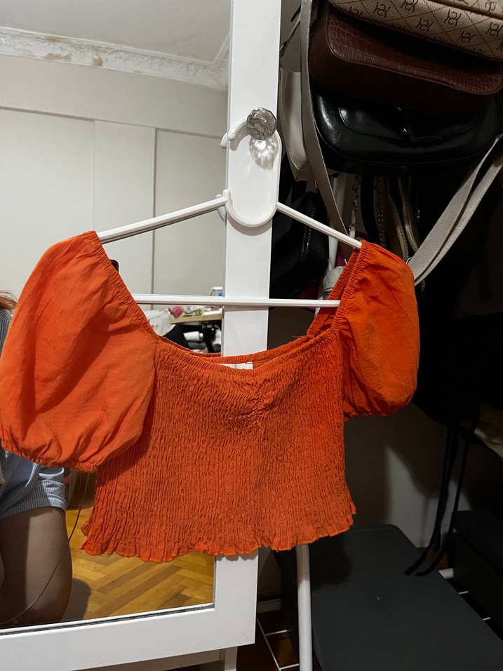 Parlak turuncu keten kumaştan, düğmeli, kısa balon kollu ve straplez kesime sahip, günlük kullanıma uygun, bohem tarzda dar kesim bluz.