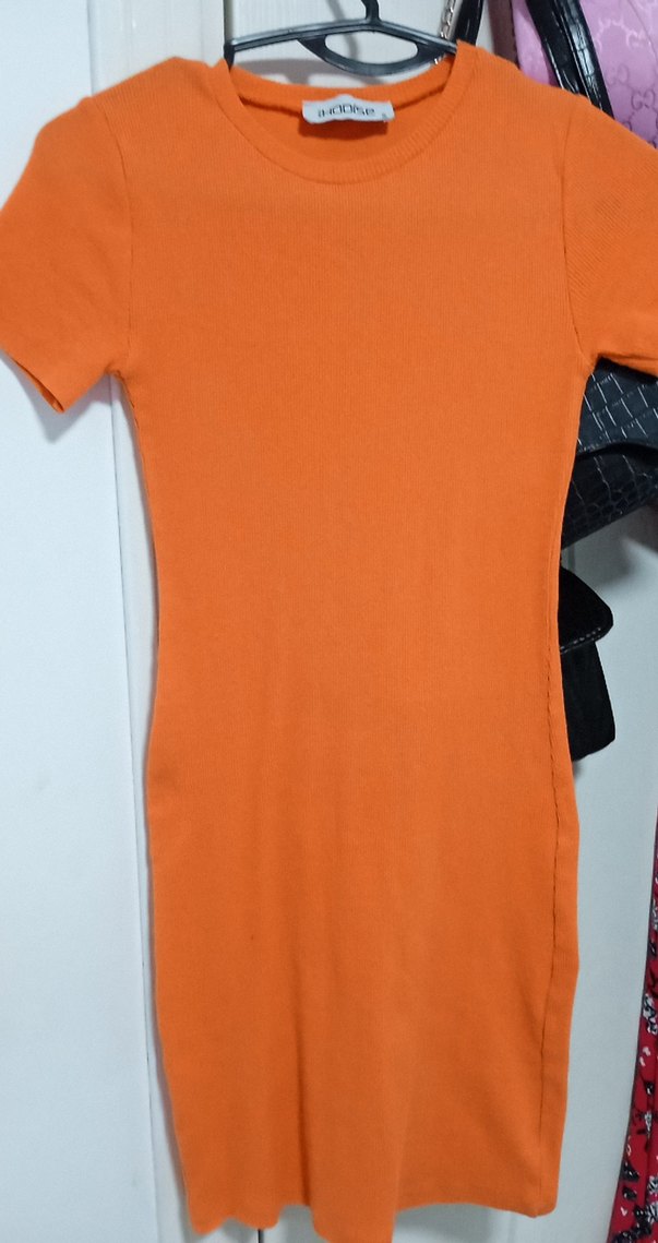 Kısa kollu, dar kesim ve yuvarlak yaka elbise. Düz, minimal tasarımlı, canlı turuncu renkte ve sentetik kumaştan üretilmiştir.