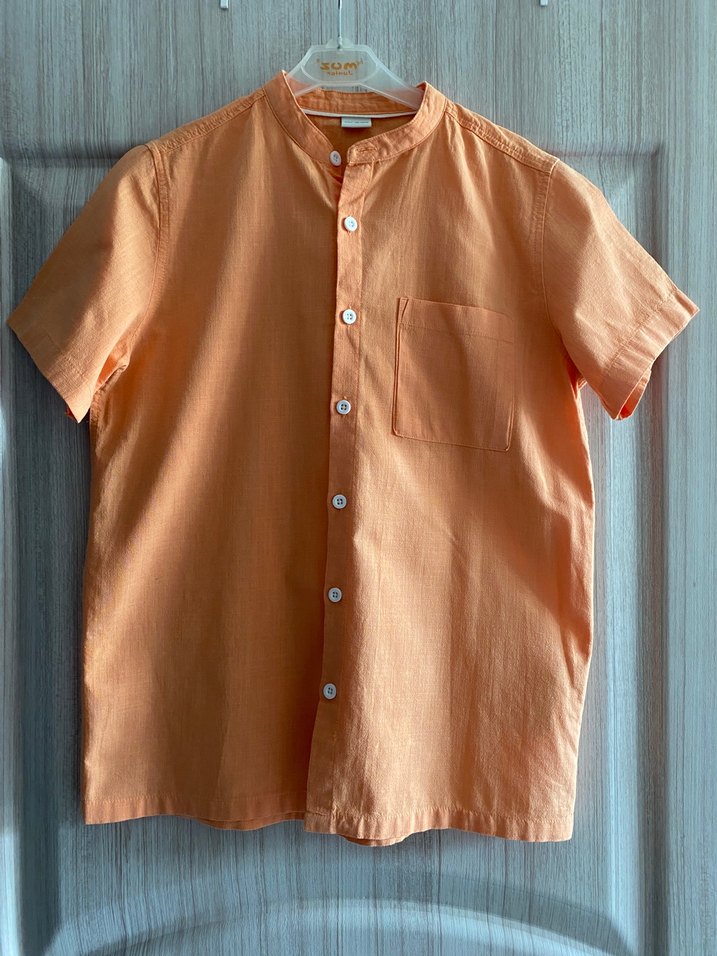 Turuncu pastel renkte, keten kumaştan yapılmış, kısa kollu, düğmeli ve yakalı erkek gömleği. Rahat kesim ve göğüs cebine sahiptir.
