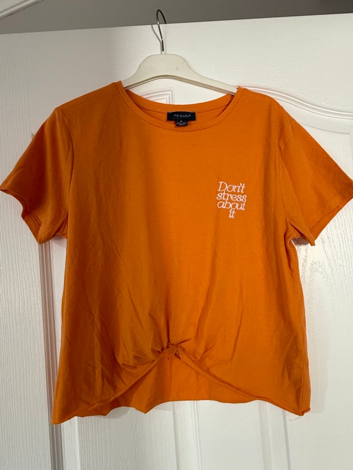 Turuncu keten kumaştan kısa kollu, salaş kesim tişört. Ön kısmında düğüm detayı ve baskılı yazı bulunur, günlük rahat giyim için uygundur.