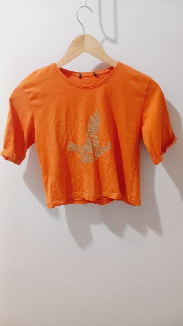 Renkli keten kumaştan, kısa kollu ve bol kesim turuncu kadın tişörtü. Yuvarlak yaka ve kısa boy, dış mekan kullanımı için uygun. crop kız Çocuk 11-12 yaşa uygundur s-m uyumlu tişört