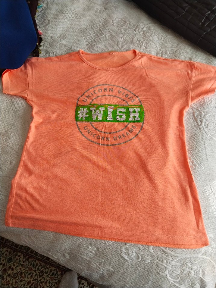 Turuncu renkli, bol kesim, kısa kollu kız çocuk tişörtü. Sentetik kumaş üzerine baskılı "#WISH" yazısı ile dikkat çeker.
