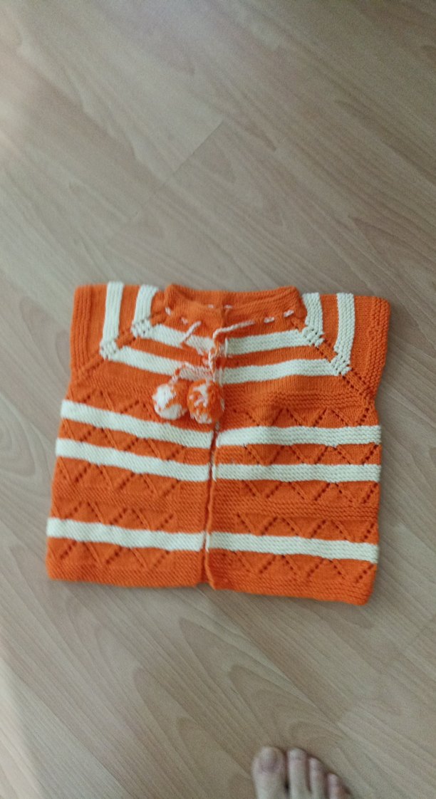 Turuncu renkli, el örgüsü kız çocuk yelek Kolsuz ve vücuda oturan kesime sahip, yakada bağcıklı klasik tarzda.