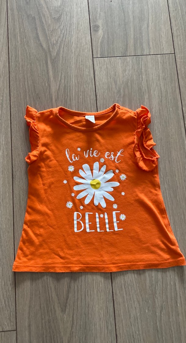 Turuncu renk, kısa fırfırlı kollu, bol kesim kız çocuk tişörtü. Üzerinde "la vie est BELLE" yazılı renkli papatya baskısı bulunur.