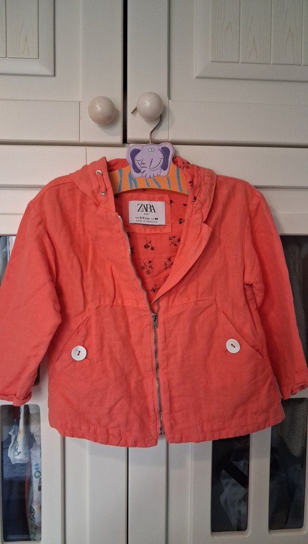 Keten kumaştan, düğmeli ve çentikli yaka detaylı turuncu kız çocuk ceketi. Rahat kesimi ve renkli baskısıyla trend sokak tarzına uygun. sol yakasında bir siyahlık var leke çıkarıcı ile ugraşmadim