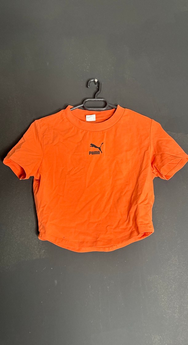 Kız çocuklar için kısa kollu, bisiklet yakalı ve vücuda oturan kesime sahip tişört. Yumuşak, sıcak kumaştan yapılmış, parlak turuncu renkte ve üzerinde baskılı Puma logosu bulunur.