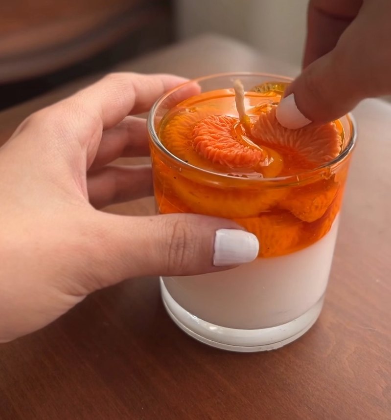 Pastel turuncu renkte, cam içinde narenciye dilimleri bulunan kokulu mum, doğal ve ferah bir hava katıyor. ️