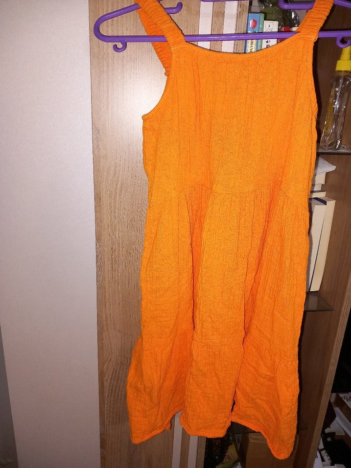 Turuncu parlak keten kumaştan, kolsuz ve salaş kesim kız elbisesi, drapeli tasarımla bohem tarzını yansıtıyor.