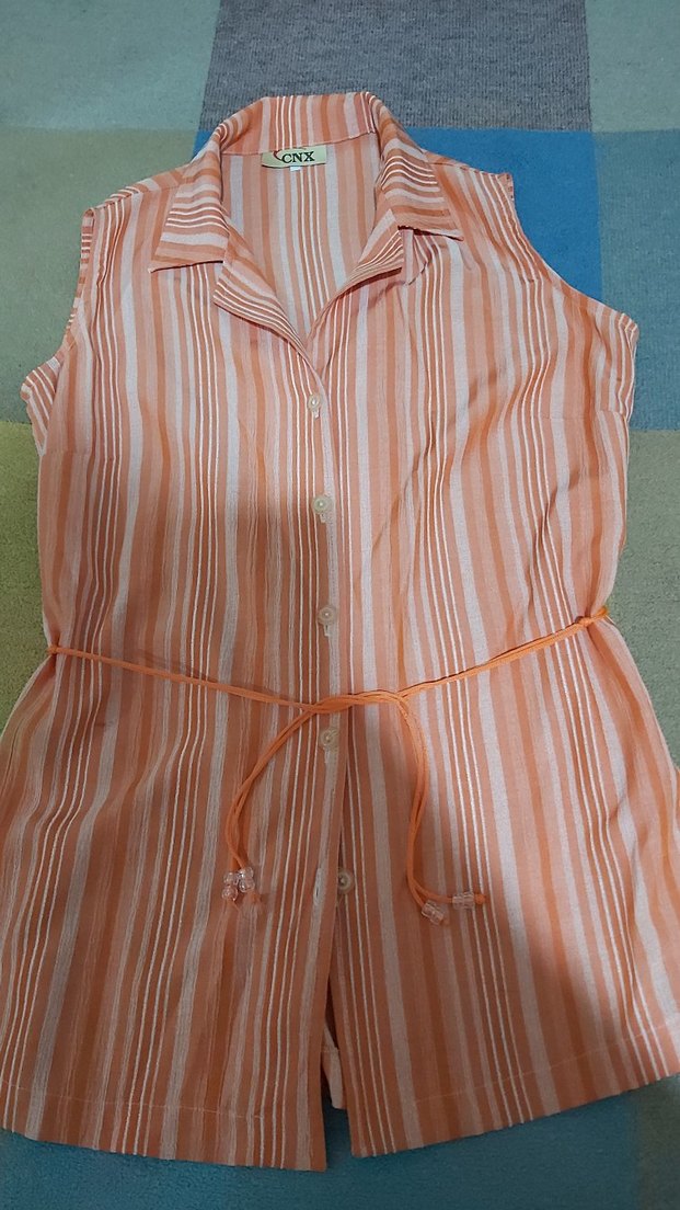 Turuncu, kolsuz, yakalı ve düğmeli midi gömlek. Rahat kesim ve bel bağcığı ile şekillendirilebilir. Yumuşak kumaştan, günlük sokak stili için uygun.az kullandığım cnx marka 2 beden (44 beden)kolsuz önden komple düğmeli şilebezi empirme kumas likrasiz turuncu renk ince beyaz cizgileri olan bluzum bel genislik ölçüsü 92 cm göğüs genislik ölçüsü 104 cm omuzdan boy uzunluk 68 cm olup hicbir defosu bulunmamaktadir