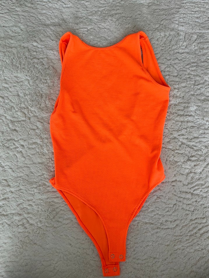 Turuncu renkli, kolsuz ve sıkı oturan kadın mayo midi boyda, cesur ve zahmetsiz şıklık sunar, günlük kullanıma uygundur.