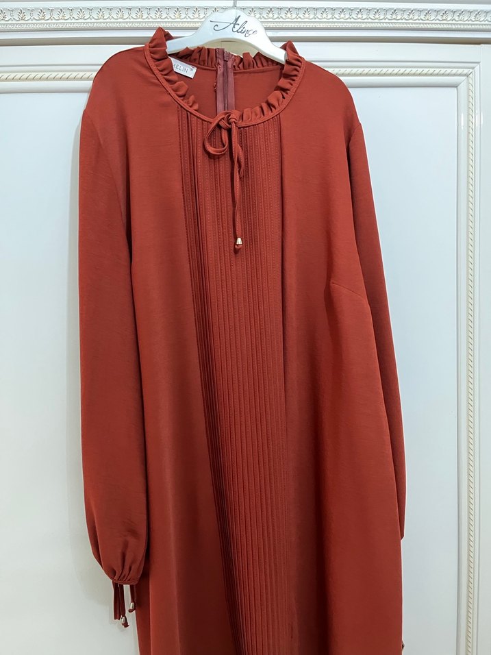 Turuncu renkte uzun kolu lastikli boynunda fırfırlı ve süsü arkadan fermuarlı kadın uzun tunik günlük hayatta kullanıma uygundur