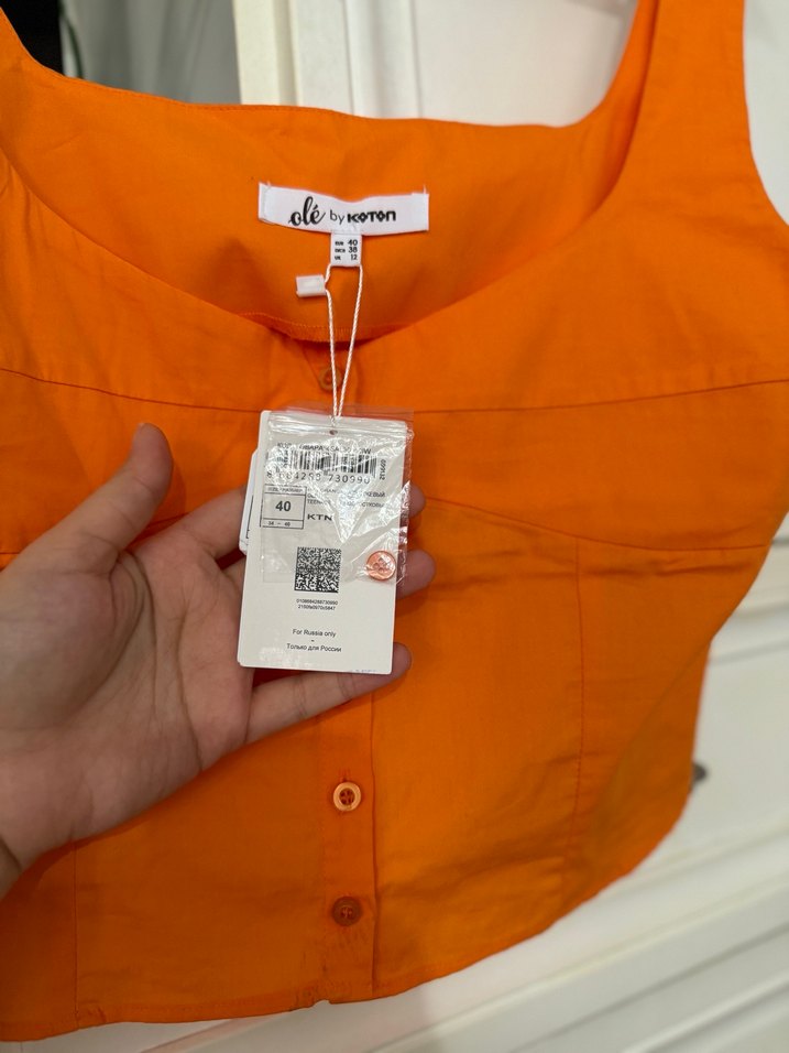 Önden düğmeli, kare yaka turuncu Koton atlet bluz. Hafif yapısı ve sade tasarımıyla sokak stiline uygun. Etiketinde 'olé by Koton' yazıyor.