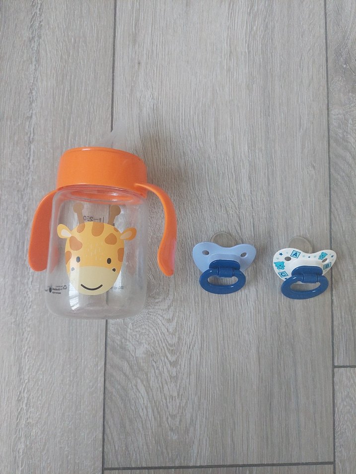 Turuncu kulplu, zürafa desenli renkli bebek biberonu ve yanında iki mavi emzik bulunur. emzikler 2 numaradır hiç kullanilmadi