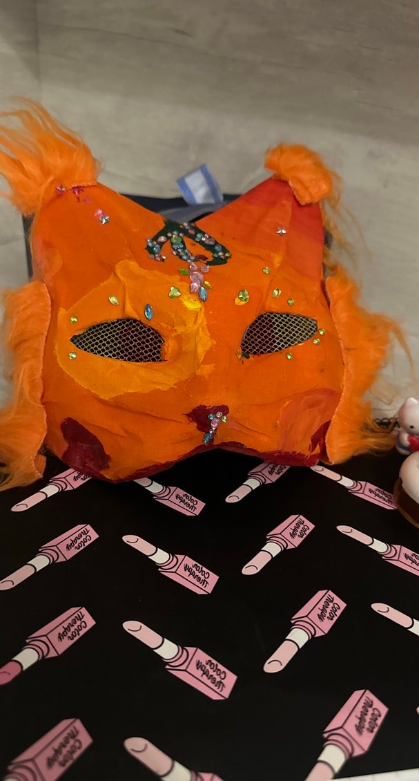 Pop kültür tarzında, kürklü ve boncuklu detaylara sahip turuncu kedi maskesi. Dokulu ve süslü detaylara çok dikkat edilmiştir.<3