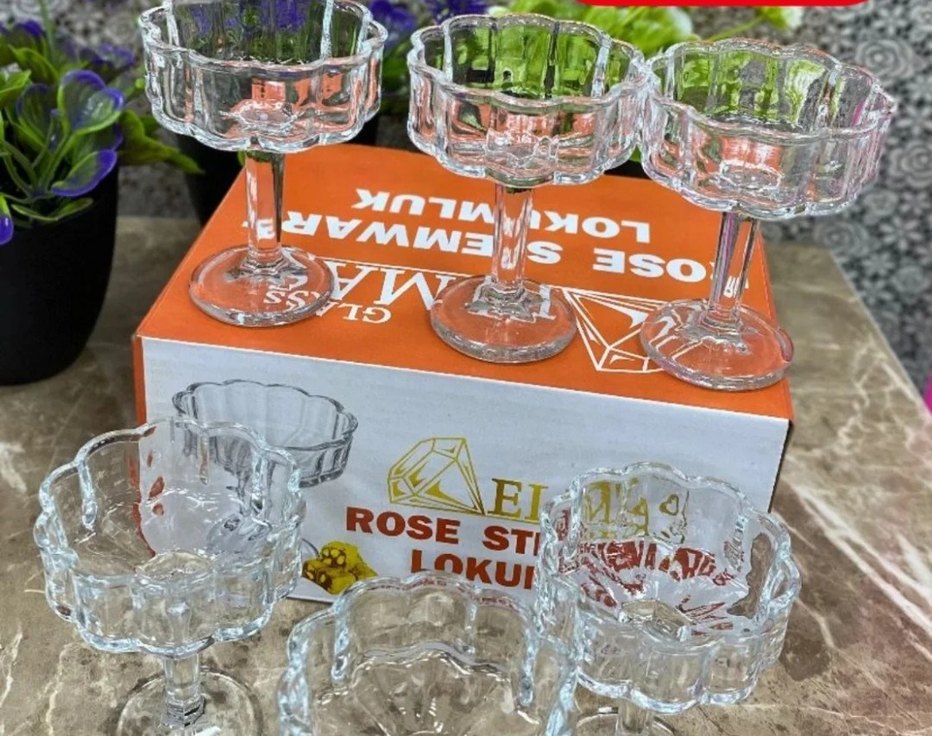 Turuncu kutusunda, dekoratif kenarlı şeffaf camdan yapılmış rose stili kadehler seti. kahve yanı lokumluk