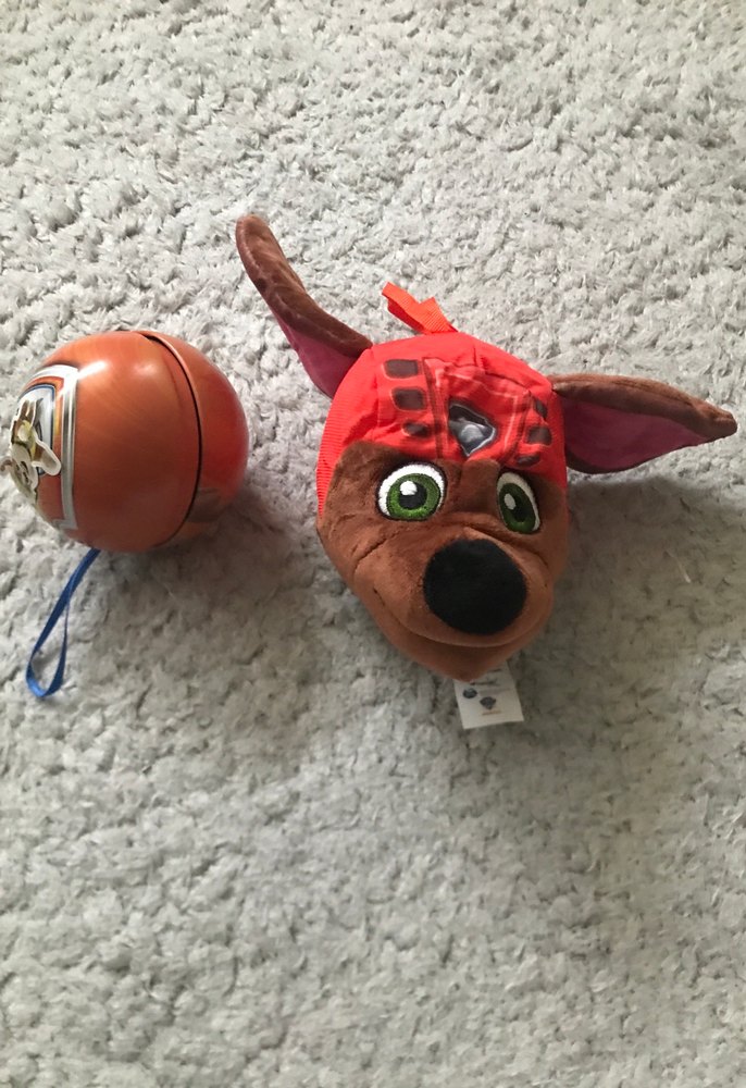 Turuncu renkli, üzerinde sevimli bir karakter bulunan ve taşıma için mavi askısı olan renkli oyuncak peluş ve topu