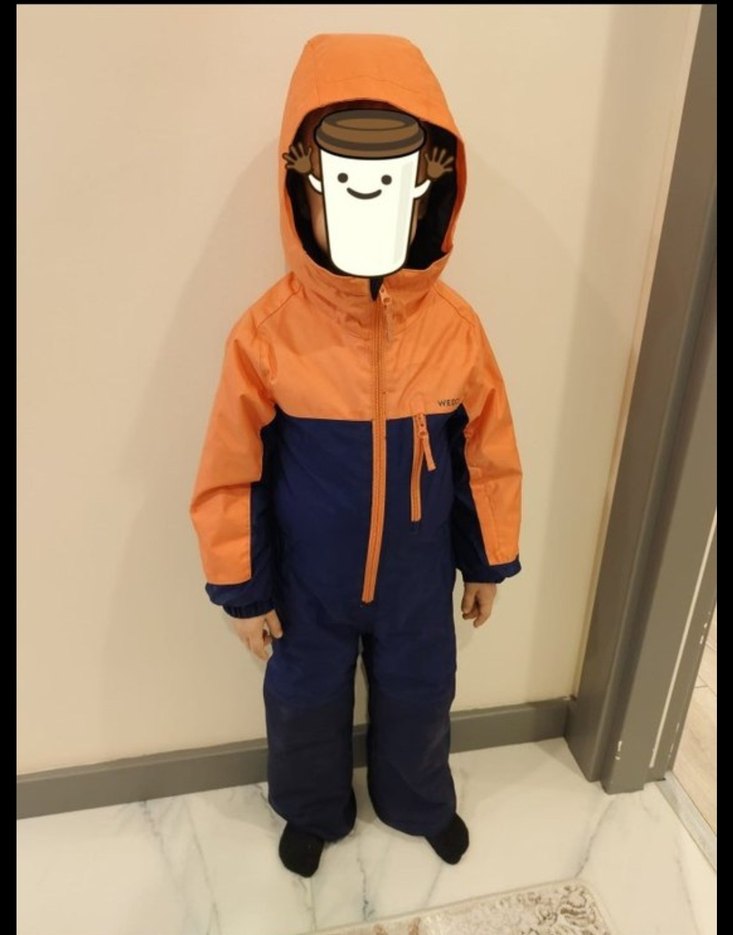 Fermuarlı ve kapüşonlu, turuncu ve lacivert renklerde erkek çocuk kayak tulumu. Yumuşak ve sıcak dokusu ile soğuk havalar için uygundur. ❄️